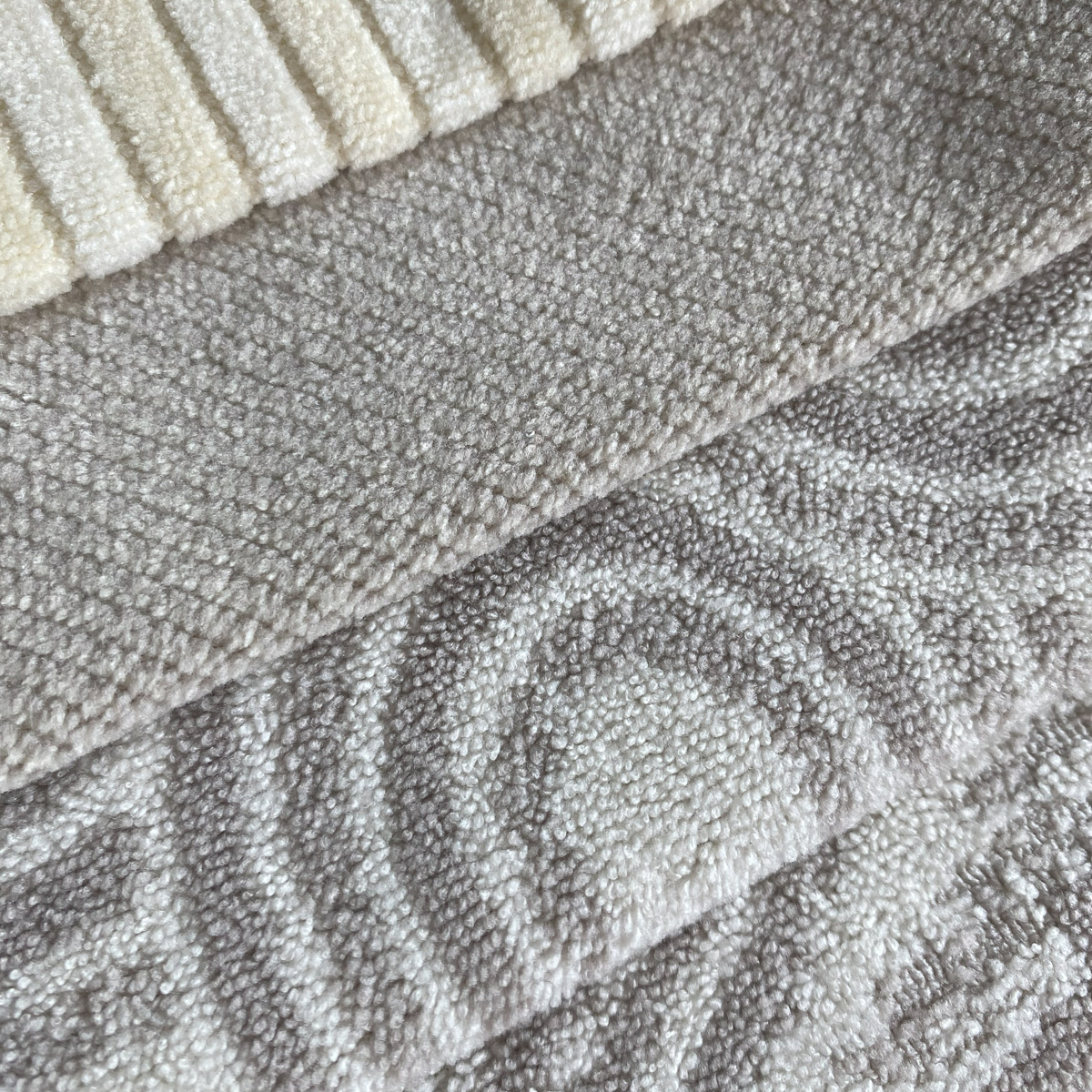 16 colores en carta: Lisa crema, geométrico crema, zigzag crema, pana crema, lisa taupe, geométrico taupe, zigzag taupe, pana taupe, lisa canela, geométrico canela, zigzag canela, pana canela, lisa gris, geométrico gris, zigzag gris y pana gris.